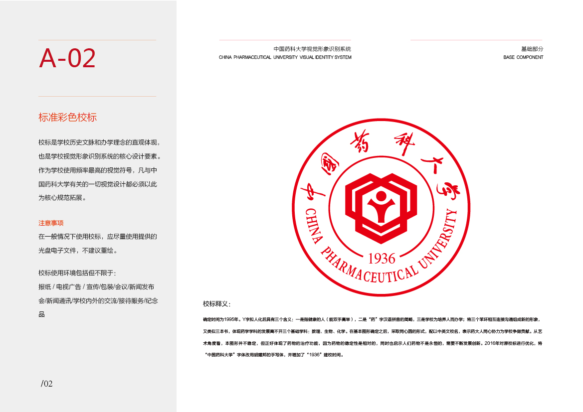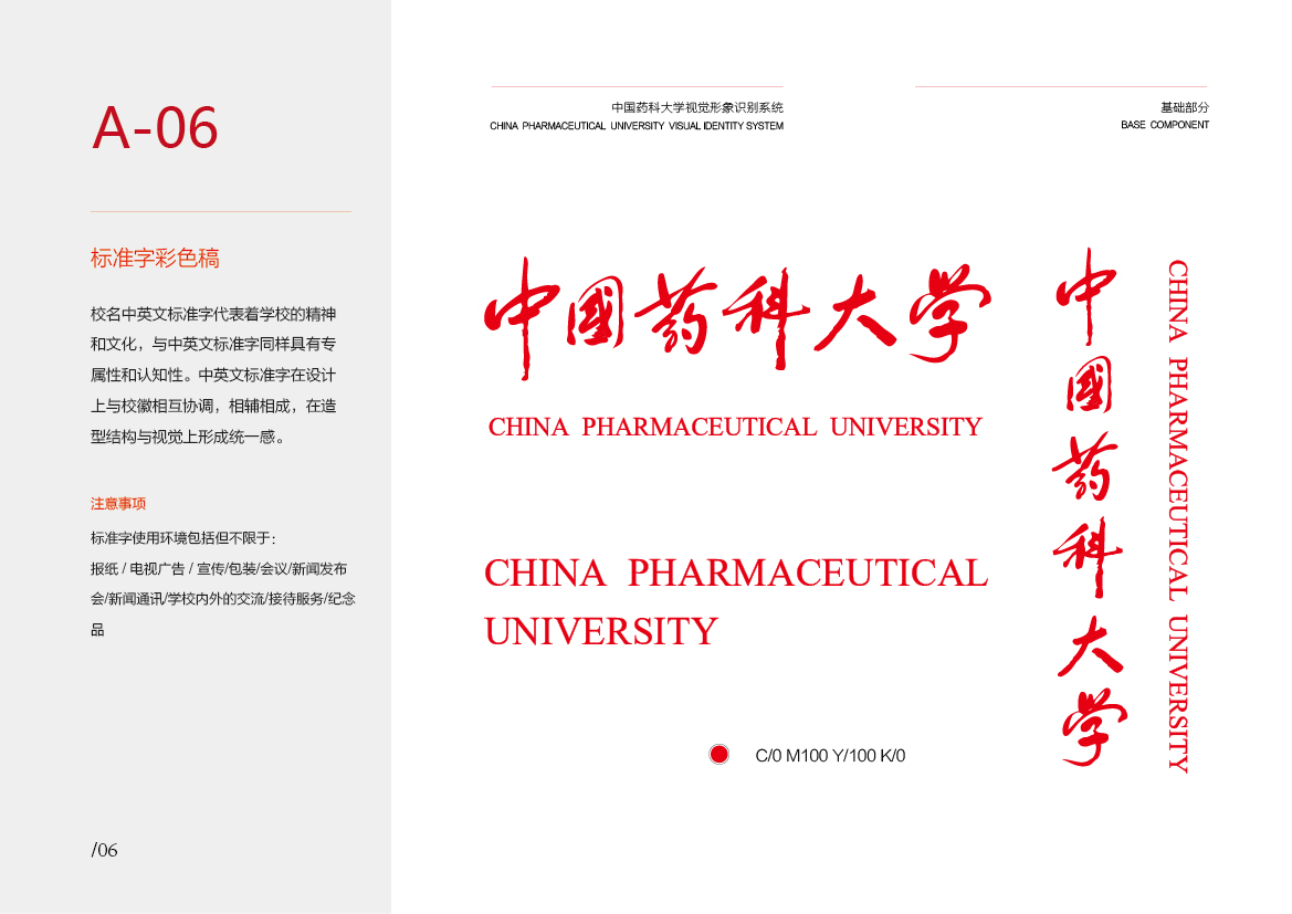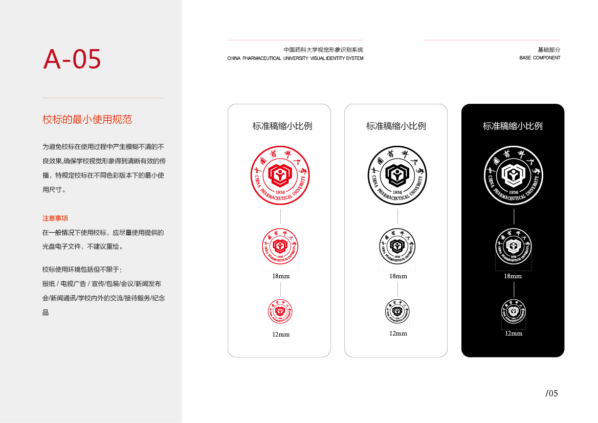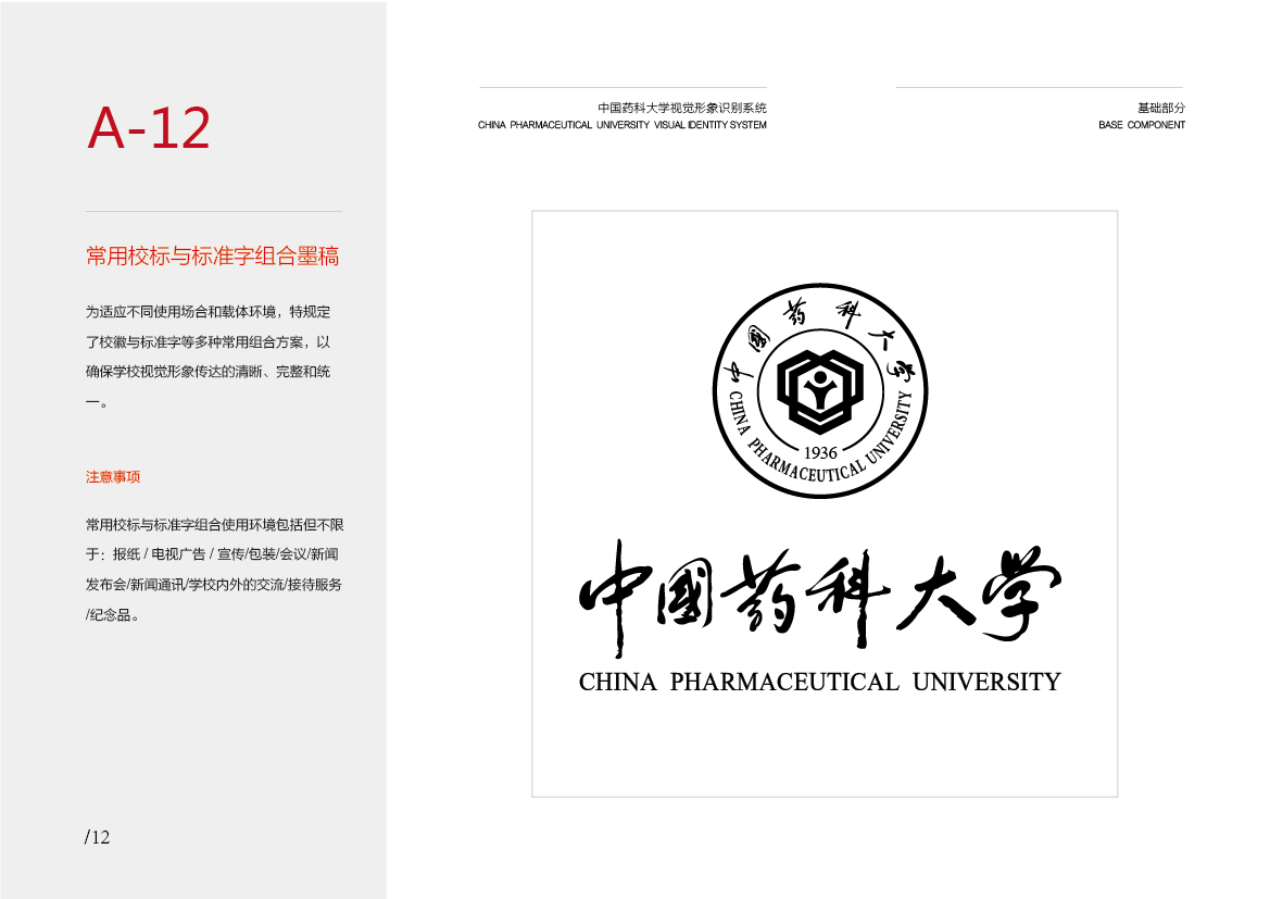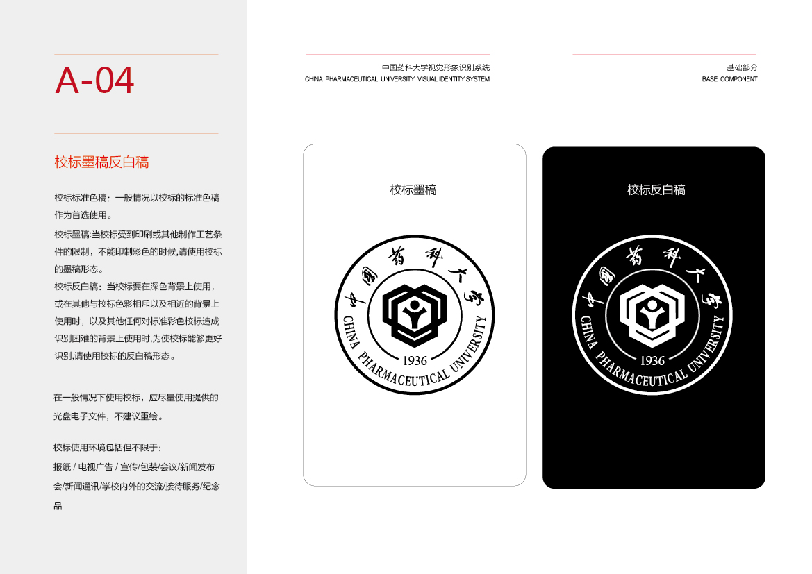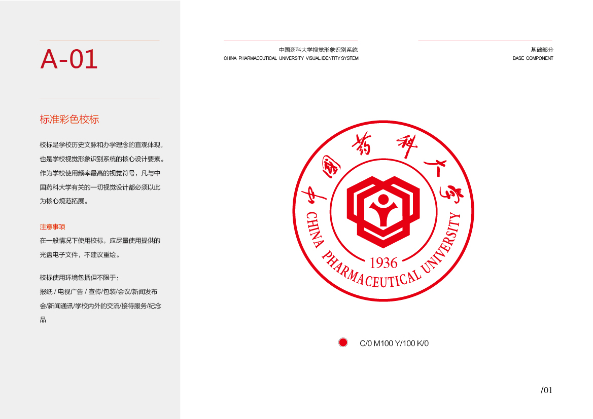 本系统内容分为基础系统和应用系统两大部分。其中基础系统包括校标、标准色、校名中英文标准字体及其组合等基本形象元素的规范性描述,各单位在使用中,应严格遵守。应用系统是基础系统在各个应用领域的使用规范总和,其中有关校标、标准字、标准色的用法也应严格遵守本系统相关规定,但本系统所列有关实际应用物品的形状、款式、材料、工艺等方案仅为示意,各单位在实际应用中可以根据具体情况酌情参考使用。