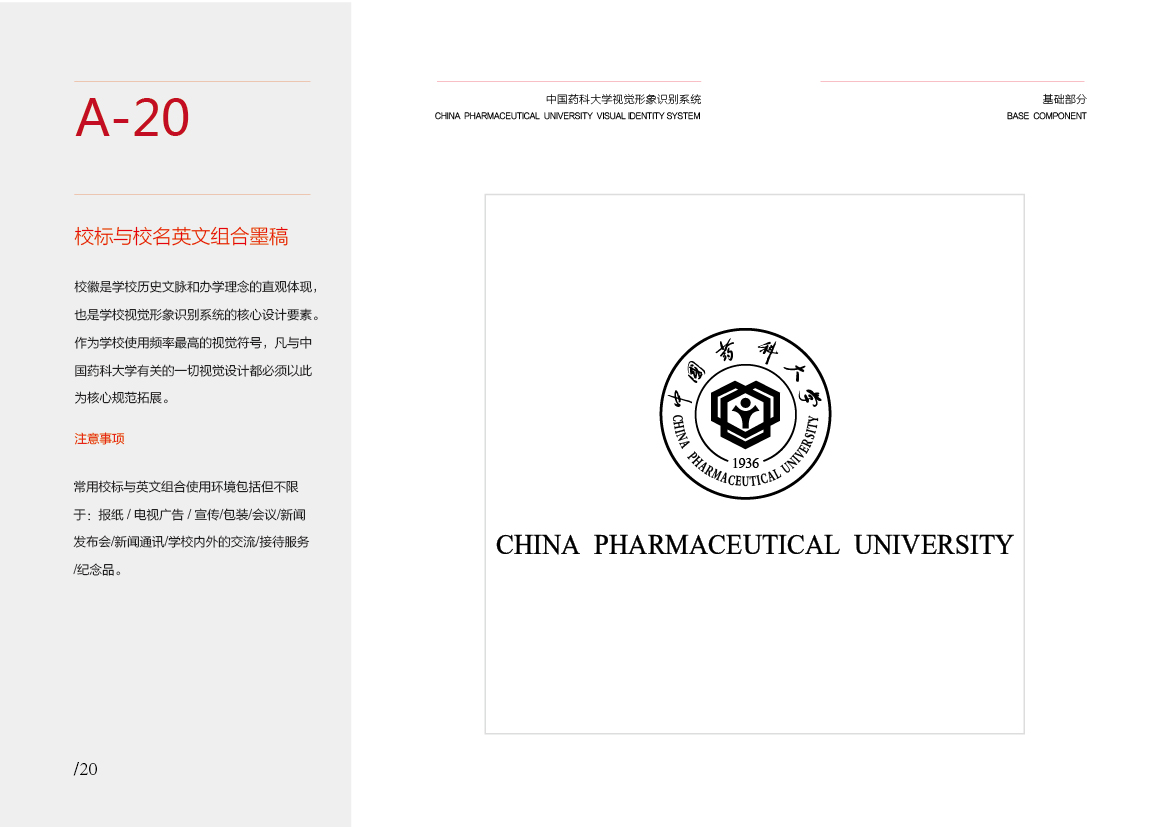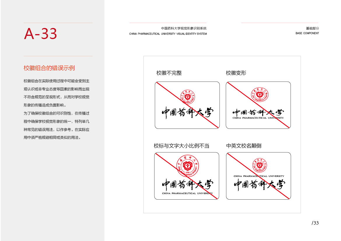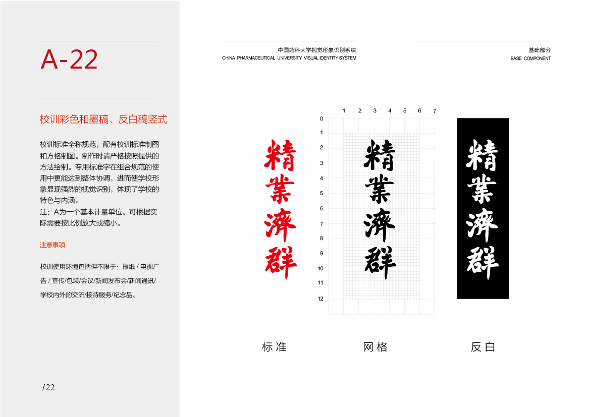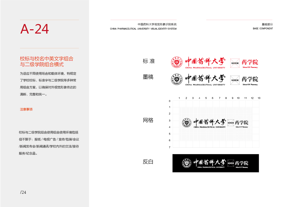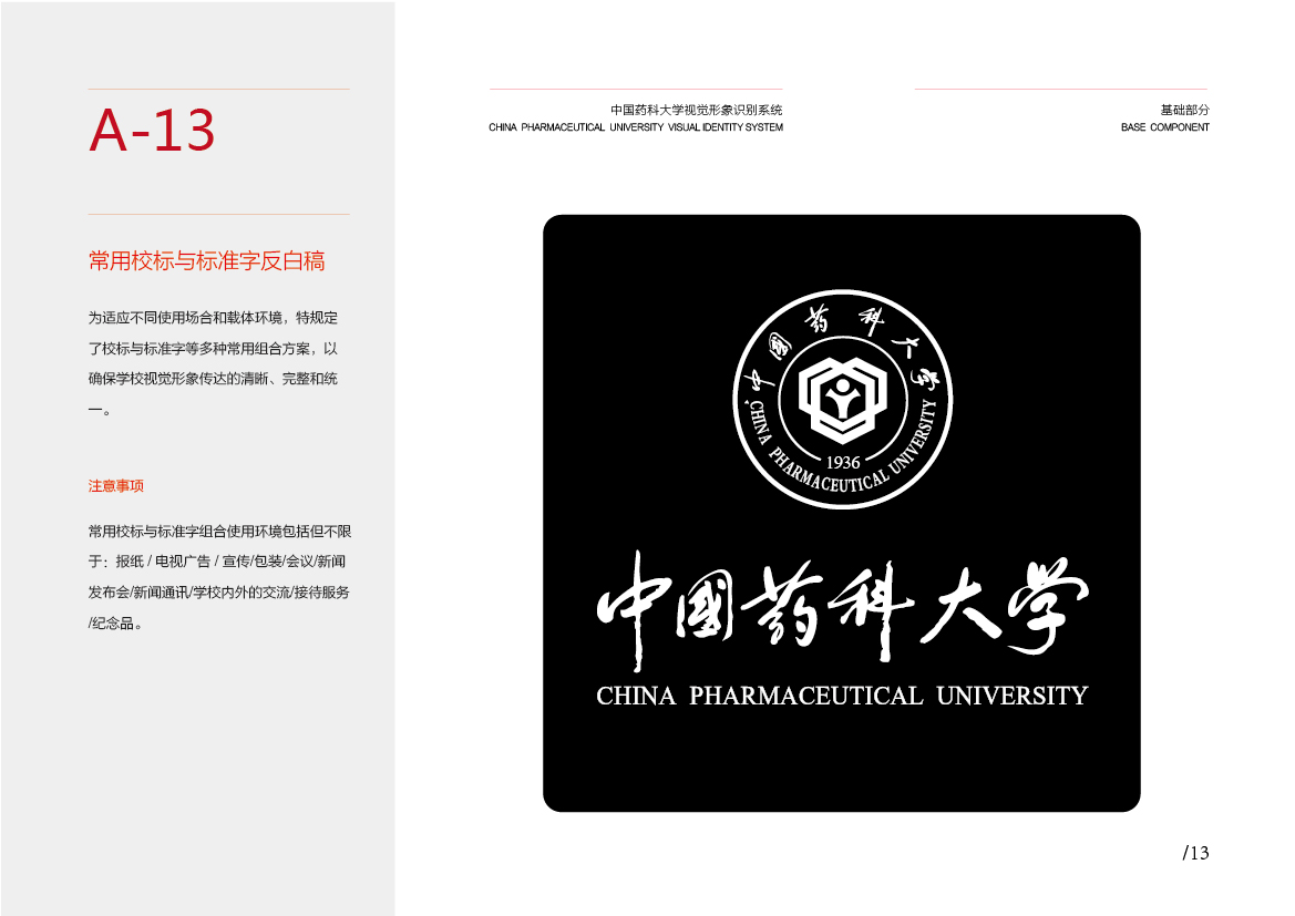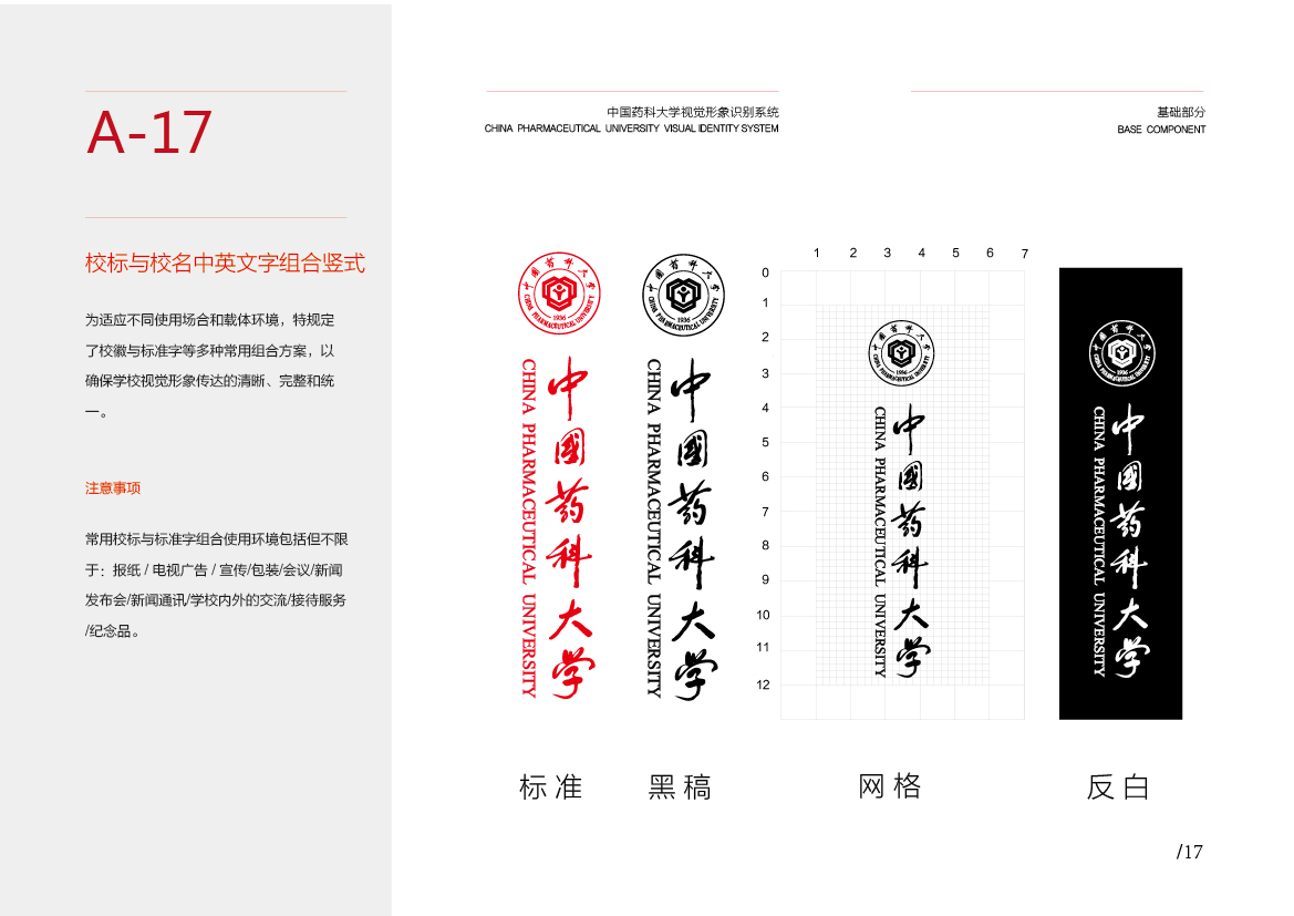 本系统内容分为基础系统和应用系统两大部分。其中基础系统包括校标、标准色、校名中英文标准字体及其组合等基本形象元素的规范性描述,各单位在使用中,应严格遵守。应用系统是基础系统在各个应用领域的使用规范总和,其中有关校标、标准字、标准色的用法也应严格遵守本系统相关规定,但本系统所列有关实际应用物品的形状、款式、材料、工艺等方案仅为示意,各单位在实际应用中可以根据具体情况酌情参考使用。